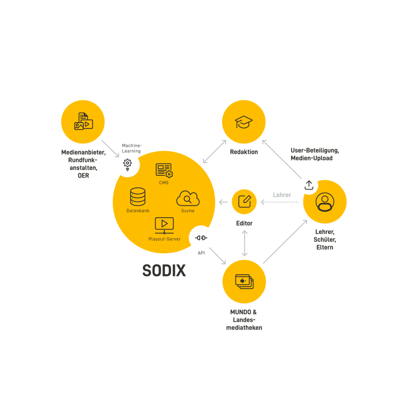 Die offene Bildungsmediathek MUNDO wird im Rahmen des Projekts SODIX vom FWU im Auftrag der 16 Länder realisiert und aus Mitteln des DigitalPakts Schule finanziert. Die Expertinnen und Experten des FWU, IT-Spezialisten und redaktionell tätige Pädagoginnen und Pädagogen, sammeln und prüfen frei im Netz verfügbare Medien anhand geltender Bildungsstandards für den Einsatz im Unterricht und arbeiten dabei eng mit den Akteuren der 16 Länder, Initiativen und Projekten der Bildungslandschaft zusammen. So wird eine zentrale Auffindbarkeit von offenen, lizenzrechtlich und qualitativ geprüften Materialien sowie eine rechtssichere Nutzung durch die Lehrkräfte garantiert. SODIX bildet das Rückgrat der ländergemeinsamen Bildungsmedieninfrastruktur. Als technischer Knotenpunkt fungiert SODIX als eine im Hintergrund agierende Austauschplattform für Bildungsmedien und stellt den Ländern über einen zentralen Content-Hub Werkzeuge zur individuellen Bearbeitung und Anreicherung der Metadaten zur Verfügung. Über eine offene Schnittstelle können angeschlossene Landessysteme und MUNDO auf die in SODIX vorgehaltenen Bildungsmaterialien zugreifen und sie in ihre Bildungsmediatheken überführen.